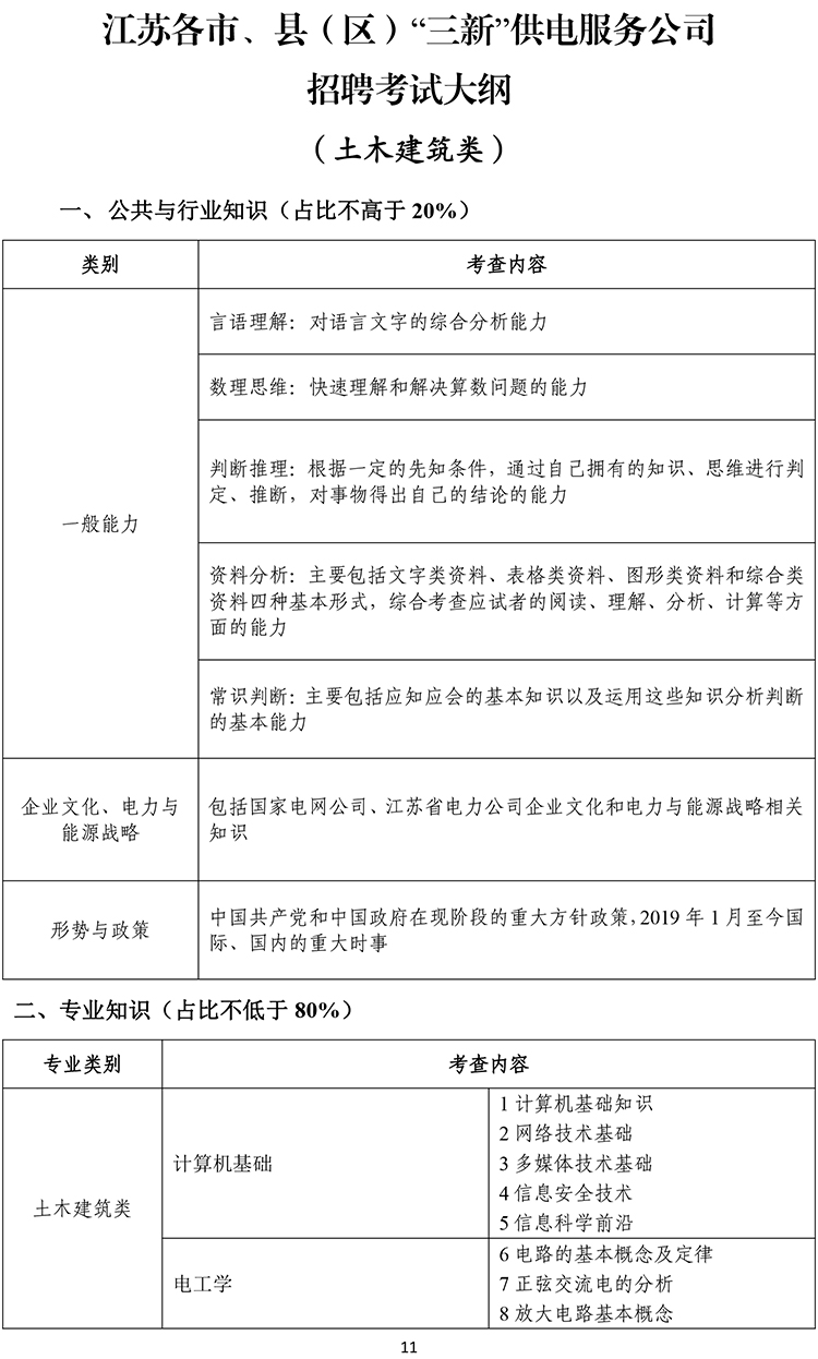 2020江蘇各市、縣(區(qū))“三新”供電服務(wù)公司招聘考試大綱(土木建筑類)